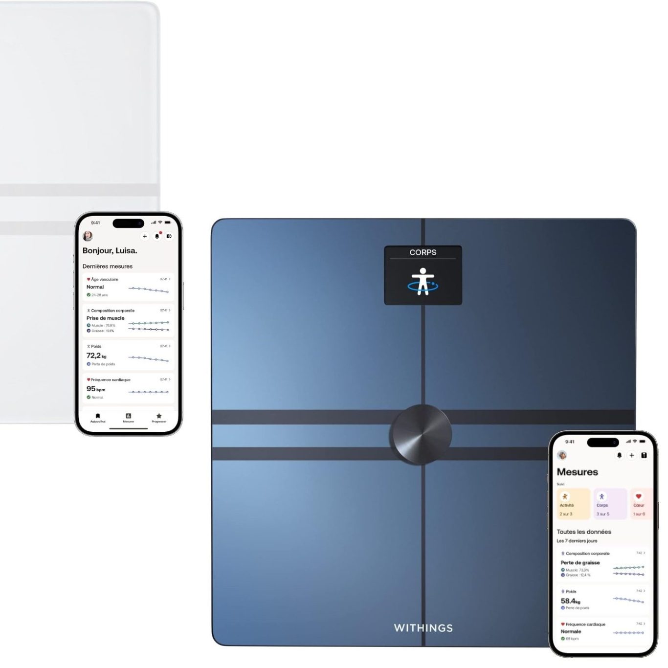 Mesure précise du poids, de l’IMC, de la masse grasse, musculaire et hydrique.